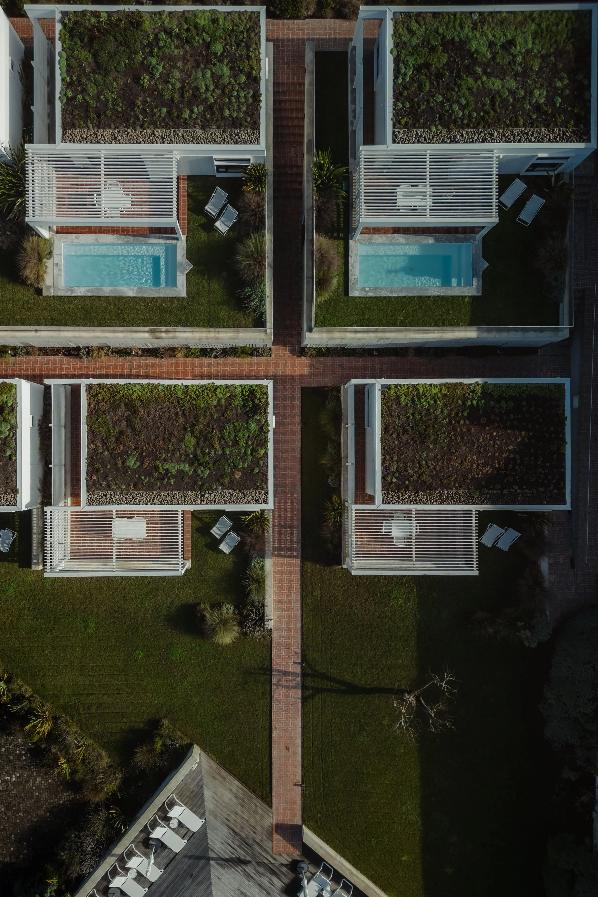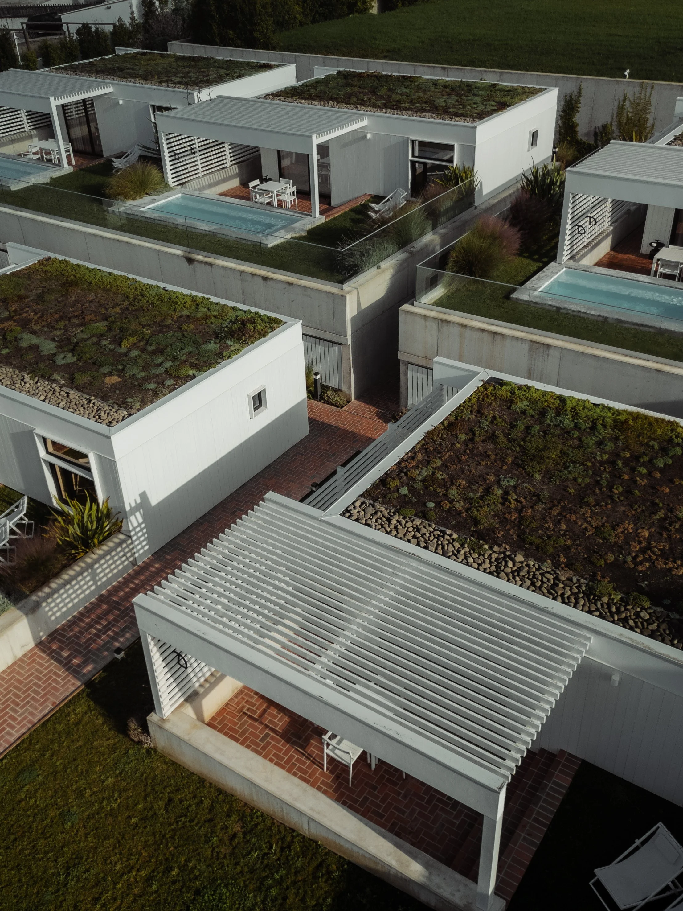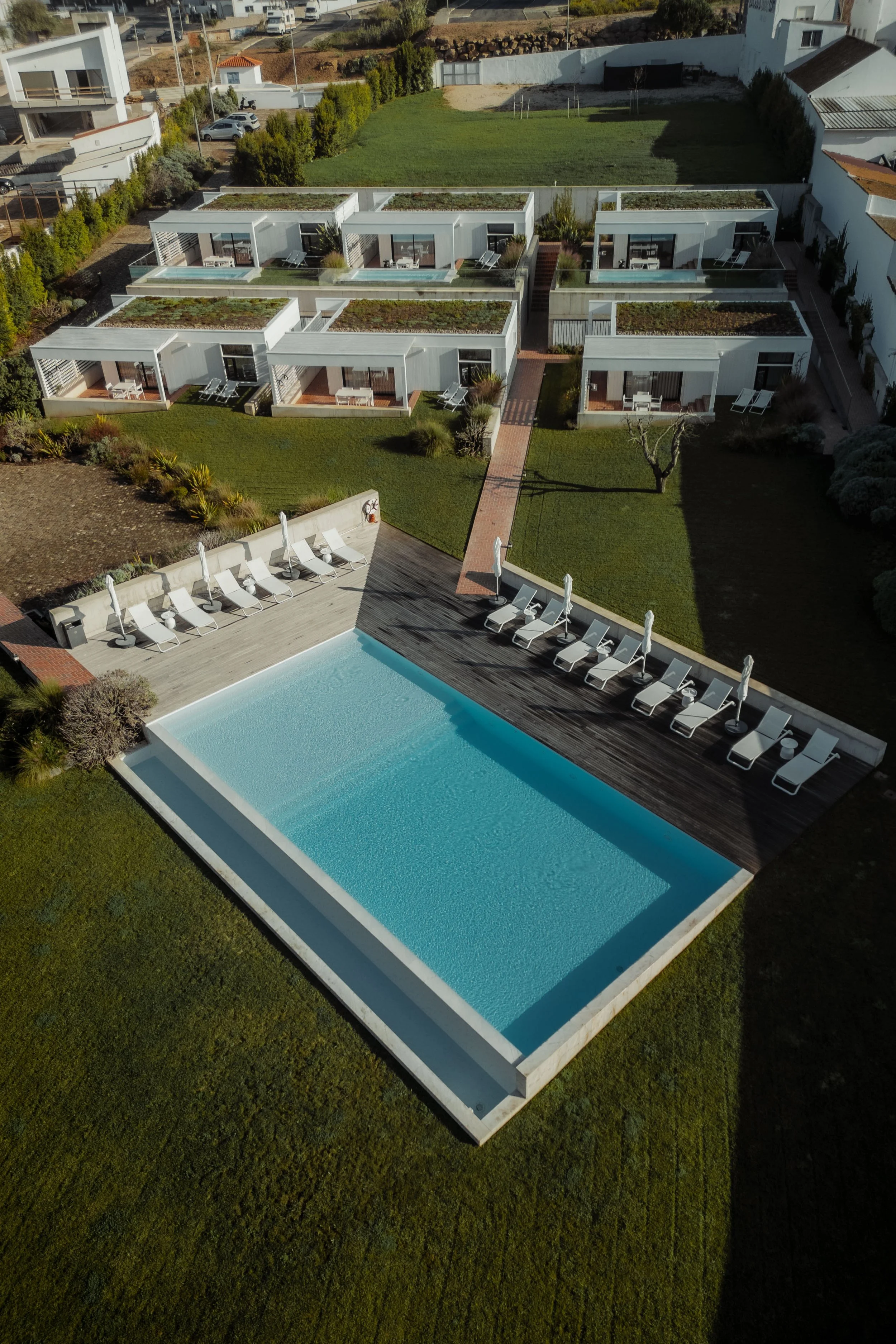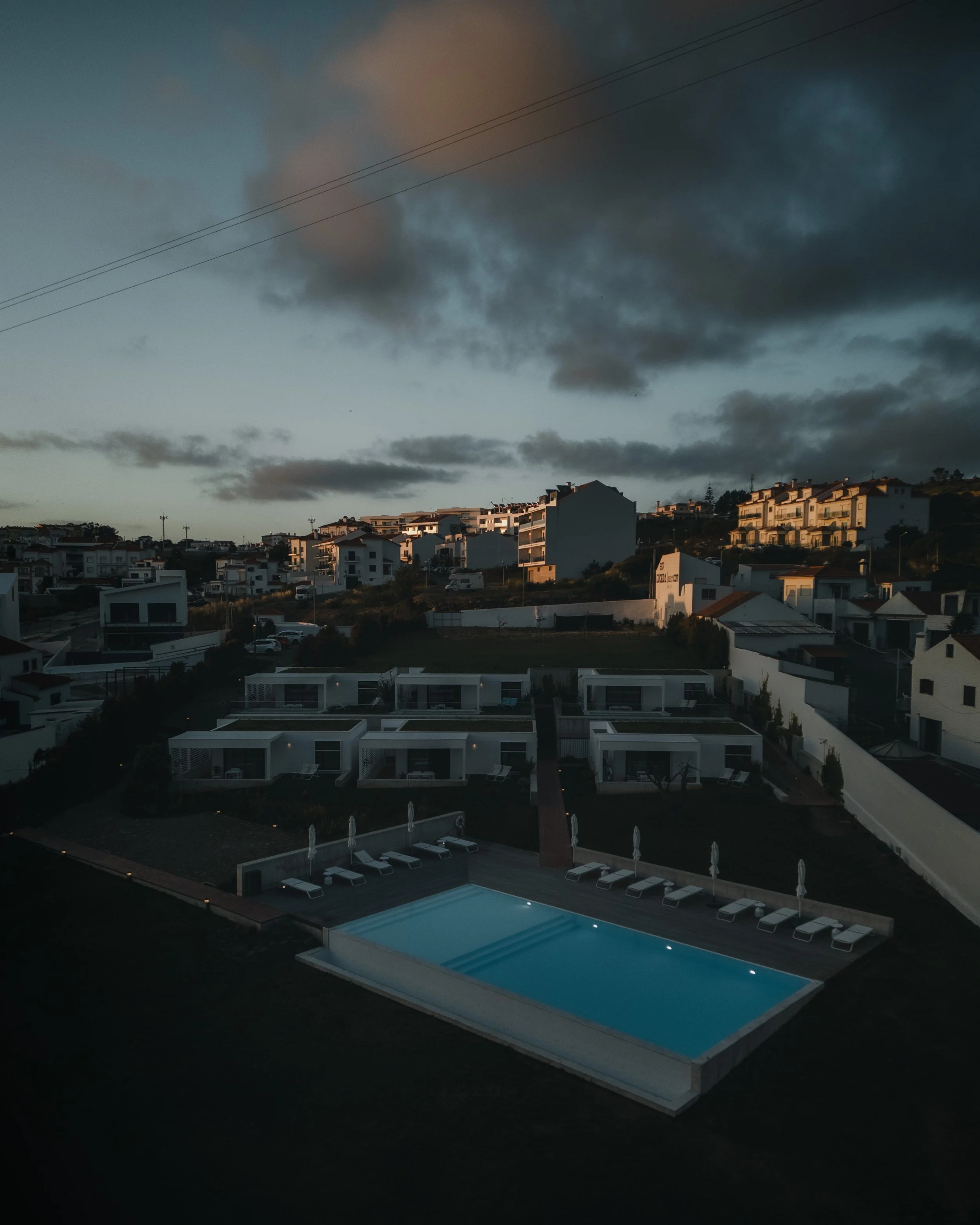 Von oben offenbaren die Ericeira Prime Villas ihre ganze architektonische Eleganz und Verbindung zur umgebenden Landschaft. Durch das Einfangen dieser Luftperspektiven konnte ich die geometrische Harmonie der Villen, die Integration von Grünflächen und den einladenden Poolbereich hervorheben. Das sorgfältig gestaltete Layout fügt sich nahtlos in die Küstenumgebung ein und vermittelt ein Gefühl von Offenheit und Ruhe. Aus dieser Perspektive wird die Beziehung zwischen Architektur, Natur und Licht noch deutlicher und unterstreicht die Ericeira Prime Villas als Rückzugsort, an dem modernes Design auf die Schönheit der portugiesischen Küste trifft.