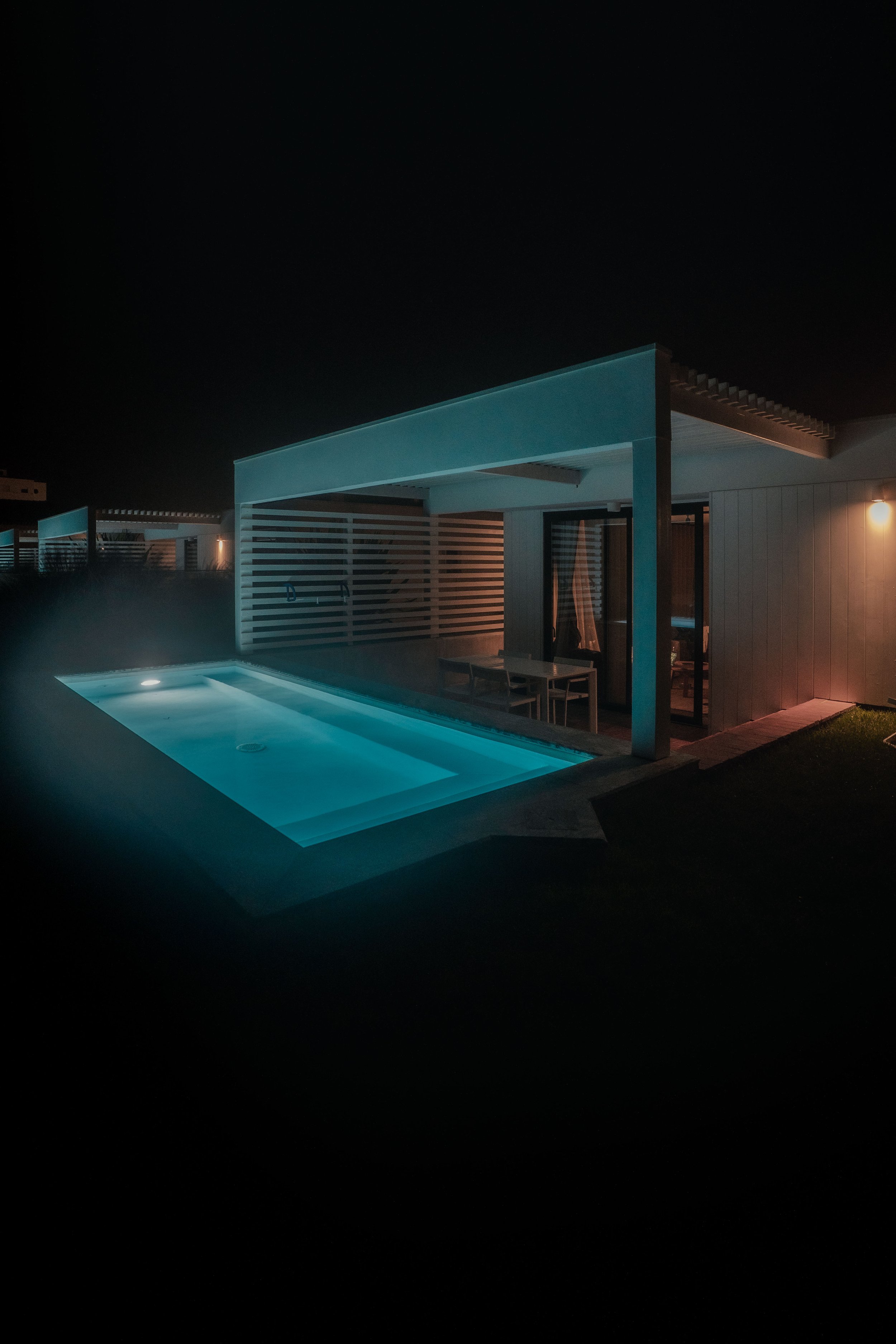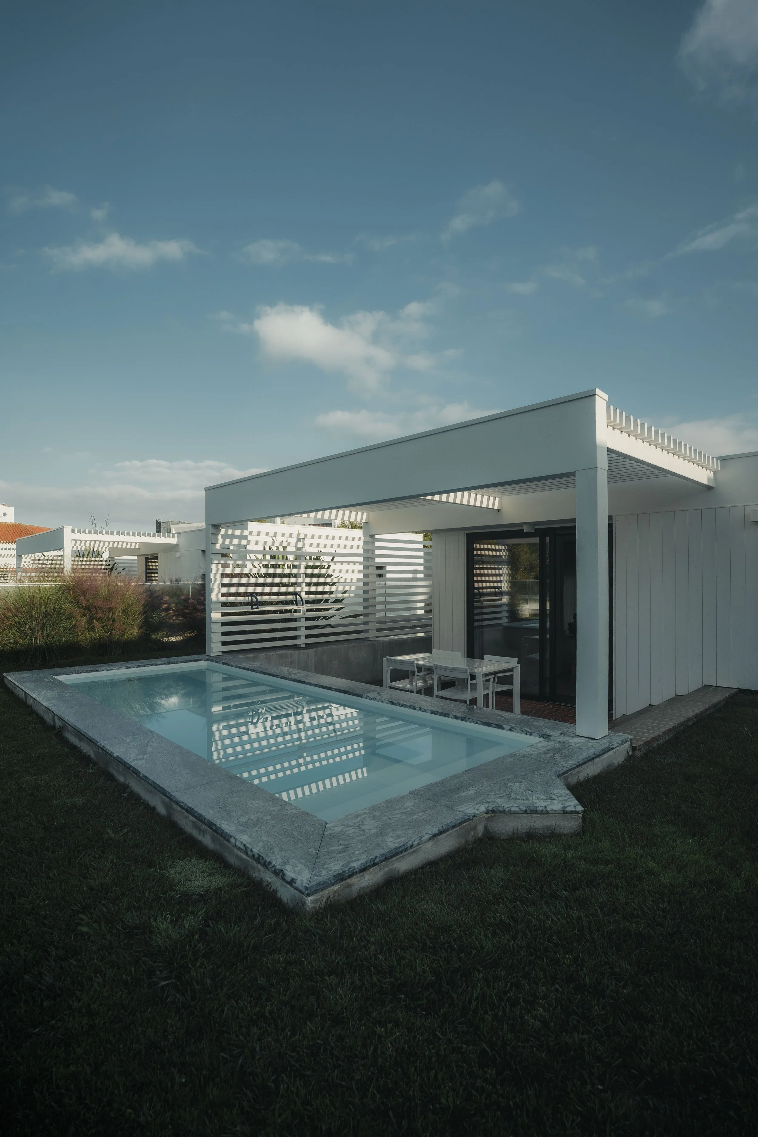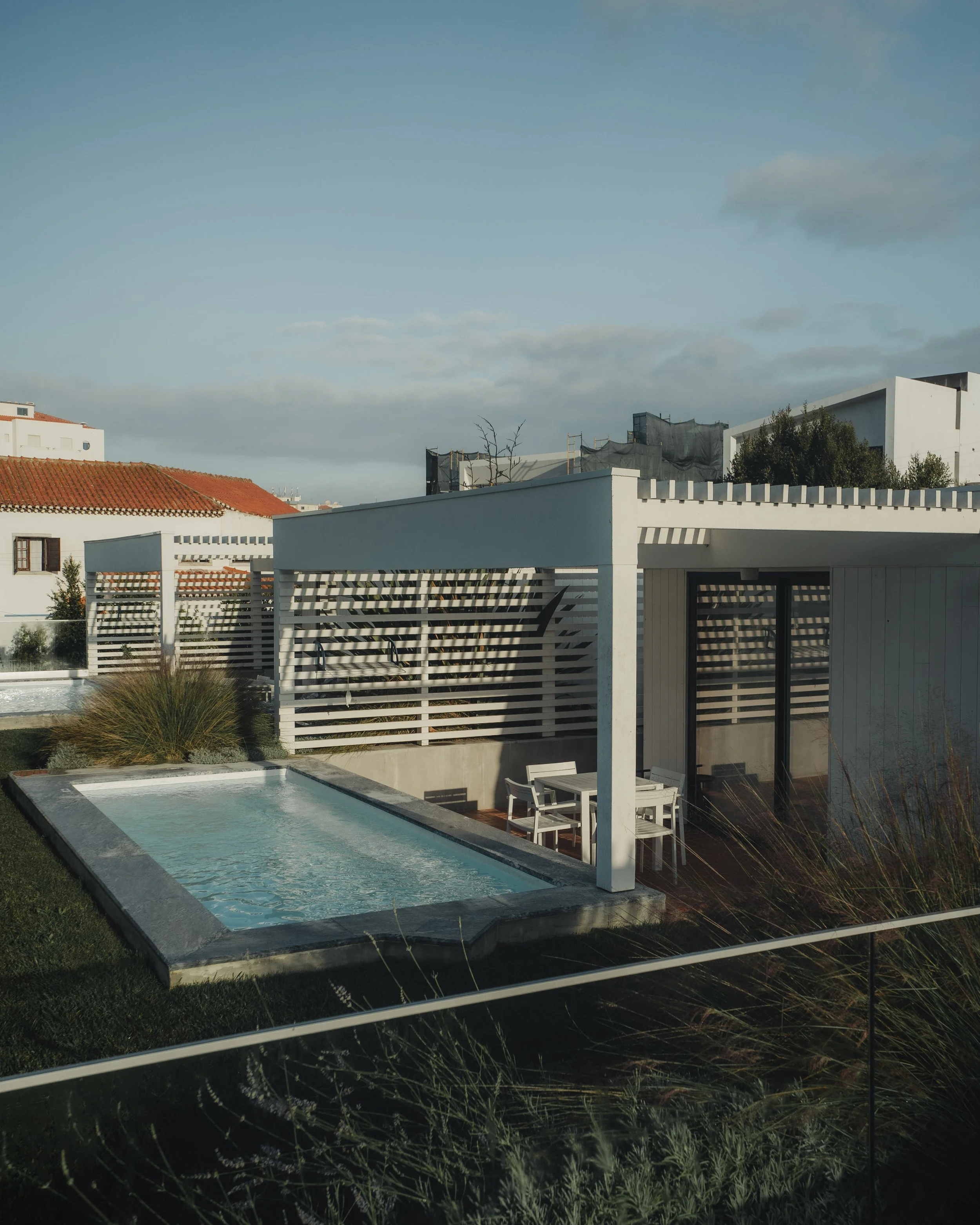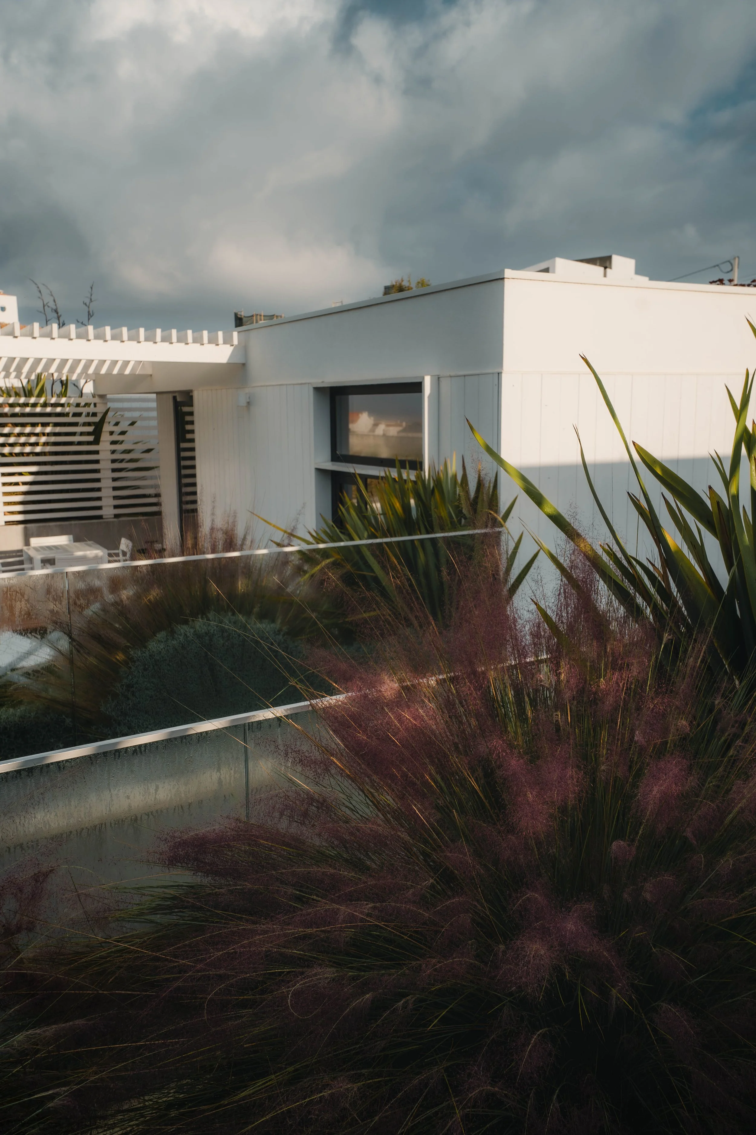 Die Ericeira Prime Villas verbinden moderne Architektur mit der natürlichen Schönheit ihrer Umgebung. In meiner Fotografie wollte ich die Verbindung zwischen strukturiertem Design und den organischen Elementen des Gartens hervorheben. Die klaren Linien der Villen bilden einen schönen Kontrast zu den wilden, windgepeitschten Gräsern und strukturierten Pflanzen und schaffen eine dynamische und doch harmonische Atmosphäre. Weiche Schatten und gefiltertes Sonnenlicht verleihen Tiefe, während die offenen Pergolen und das sorgfältig platzierte Grün ein Gefühl der Gelassenheit erzeugen. Die Mischung aus minimalistischen Strukturen und üppigen natürlichen Elementen definiert die Essenz der Ericeira Prime Villas – ein Ort, an dem Design und Natur in perfekter Balance existieren.