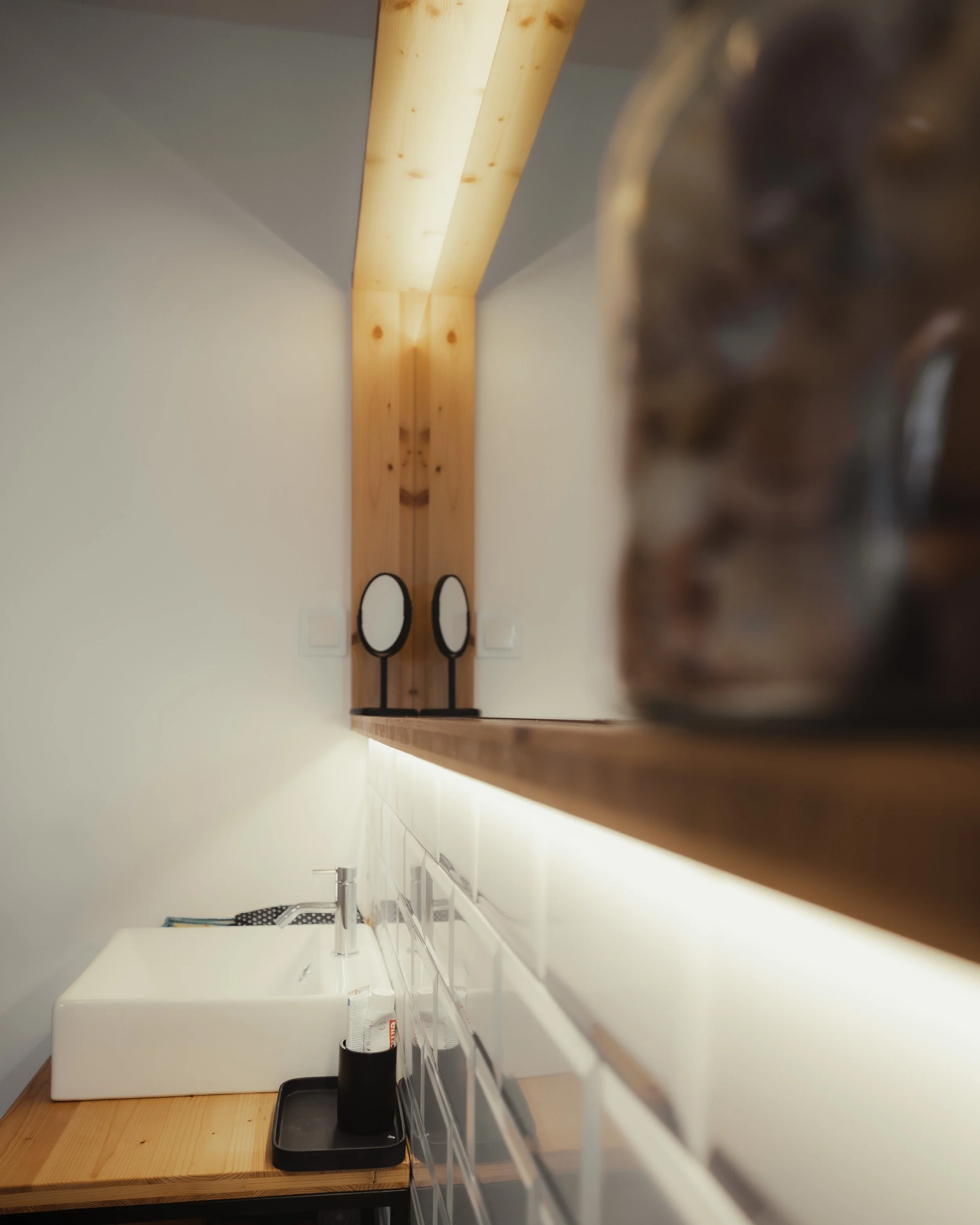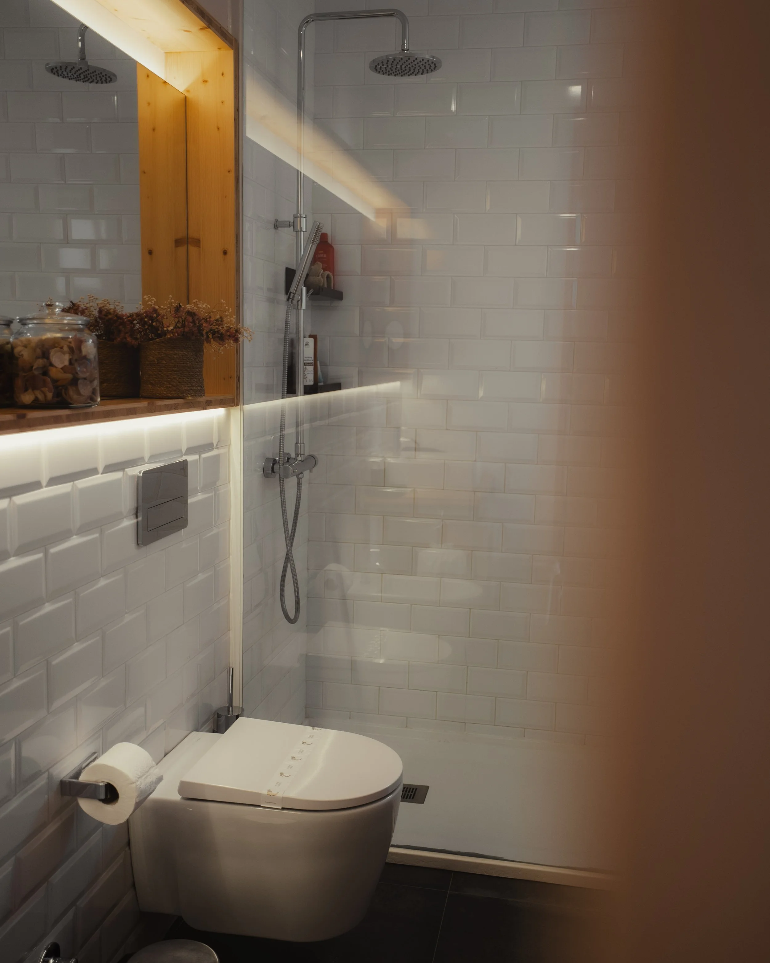 Die Badezimmer der Ericeira Prime Villas spiegeln die gleiche raffinierte Ästhetik wider, die sich im gesamten Gebäude findet – eine Balance zwischen moderner Schlichtheit und natürlicher Wärme. Die Kombination aus sauberen weißen Fliesen, warmen Holzelementen und sanfter Umgebungsbeleuchtung schafft eine Spa-ähnliche Atmosphäre, die das Gefühl der Entspannung verstärkt. Durchdachte Details wie die sorgfältig angeordneten Toilettenartikel, flauschigen Handtücher und stilvollen Spiegel tragen zu dem luxuriösen und doch minimalistischen Erlebnis bei. Mein Ziel mit diesen Bildern war es, nicht nur das Design hervorzuheben, sondern auch das Gefühl von Komfort und Gelassenheit, das die Ericeira Prime Villas auszeichnet .