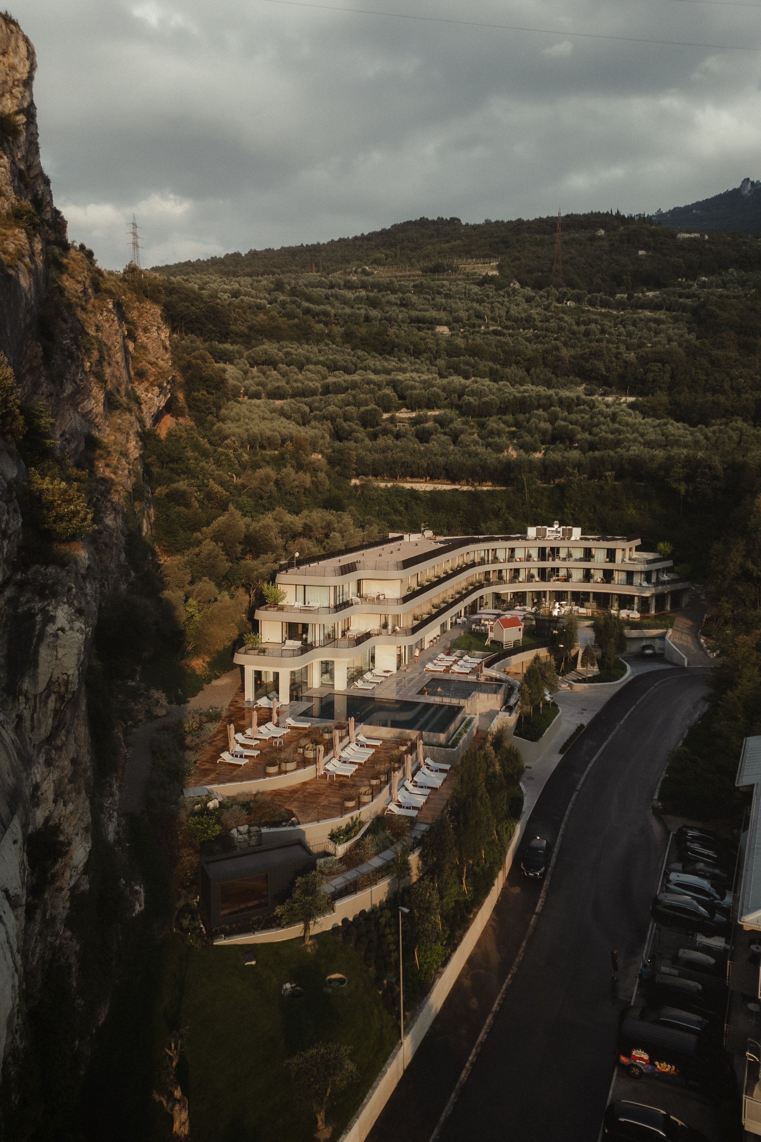 Das Hotel ist in den Berghang oberhalb von Torbole gebaut – mit freiem Blick über den Gardasee bis hin zu den steilen Felswänden dahinter.