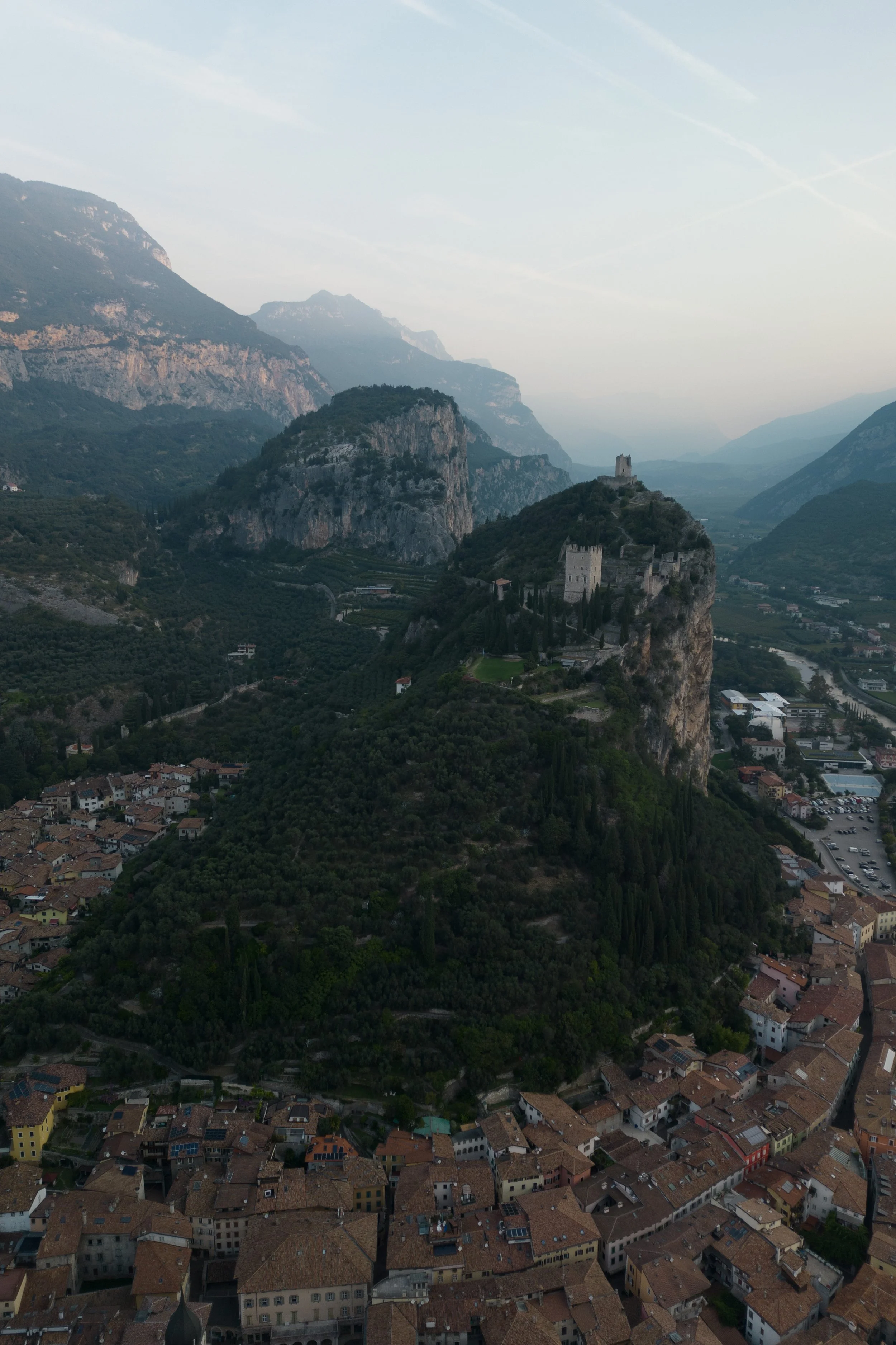 This photo was taken above the town of Arco, just before sunset, when the warm sunrise light settles gently over the valley. From the air, the castle blends into the rock, the town lies quietly below, and the mountains form soft layers fading into the distance.
