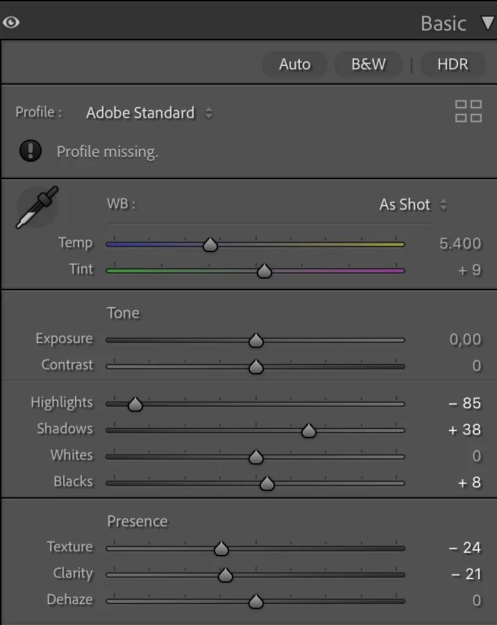 Texture –24 and Clarity –21 to remove digital sharpness and create a smoother, more film-like surface