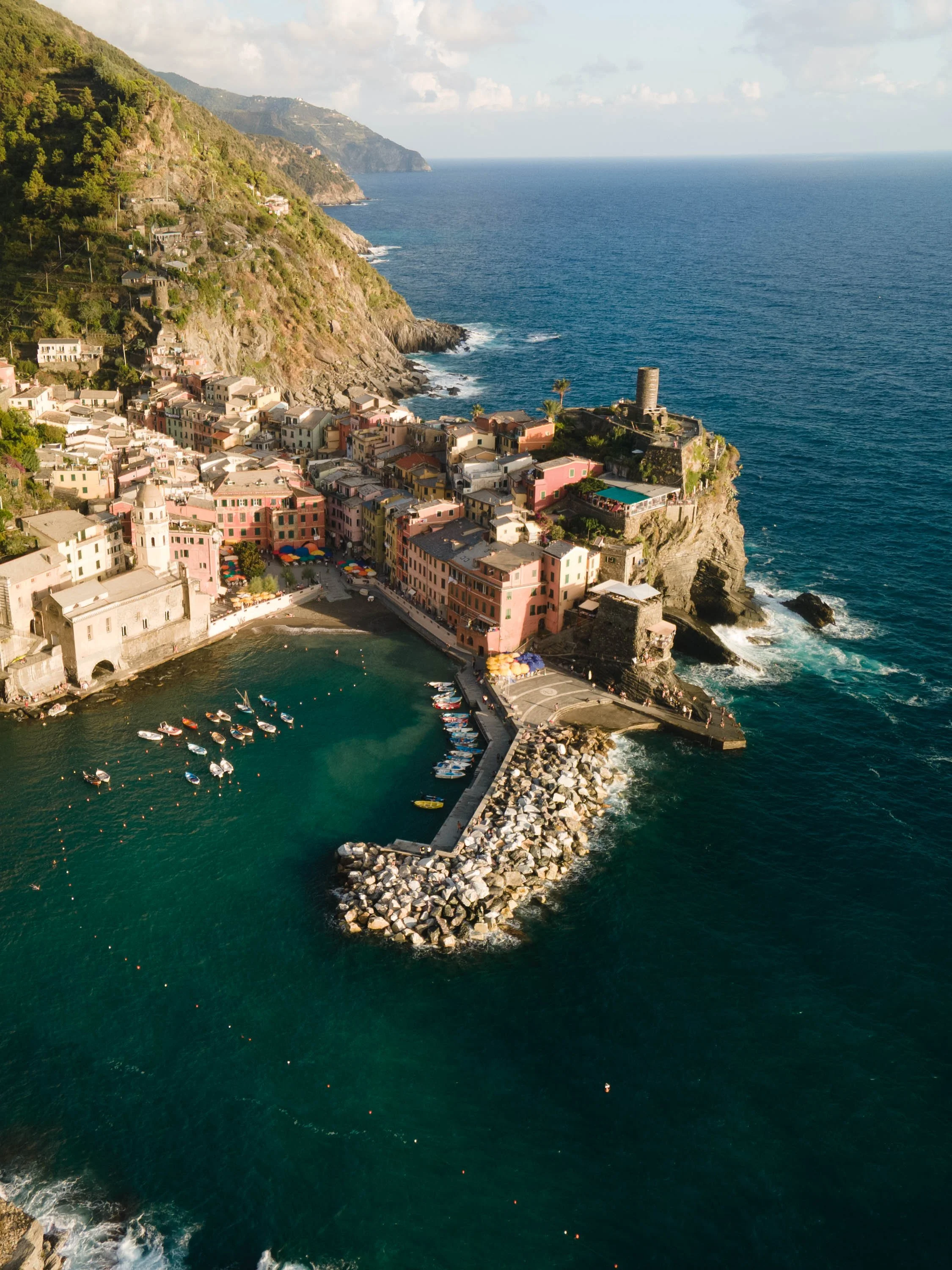 This drone shot of Vernazza shows one of Italy’s most iconic coastal villages — colorful houses, dramatic cliffs, and deep blue water shaping a natural amphitheater around the harbor.