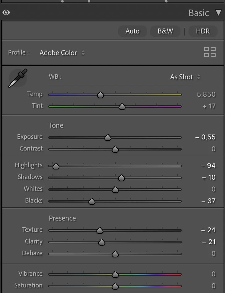 The exposure was slightly reduced (Exposure –0.55) to bring the scene closer to how it felt in reality and to avoid a washed-out look. Highlights were pulled down strongly (–94) to control the bright clouds and preserve detail in the sky, while Shadows were lifted just a little (+10) to keep the land readable without flattening it.