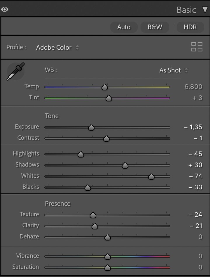 The edit began with balancing the overall exposure. I slightly darkened the image (Exposure –1.35) to make the fog feel denser and more cinematic. Then I lowered the Highlights (–45) to keep the white areas of the mist under control while brightening the Shadows (+30) so that the swan and the darker water could emerge more clearly.