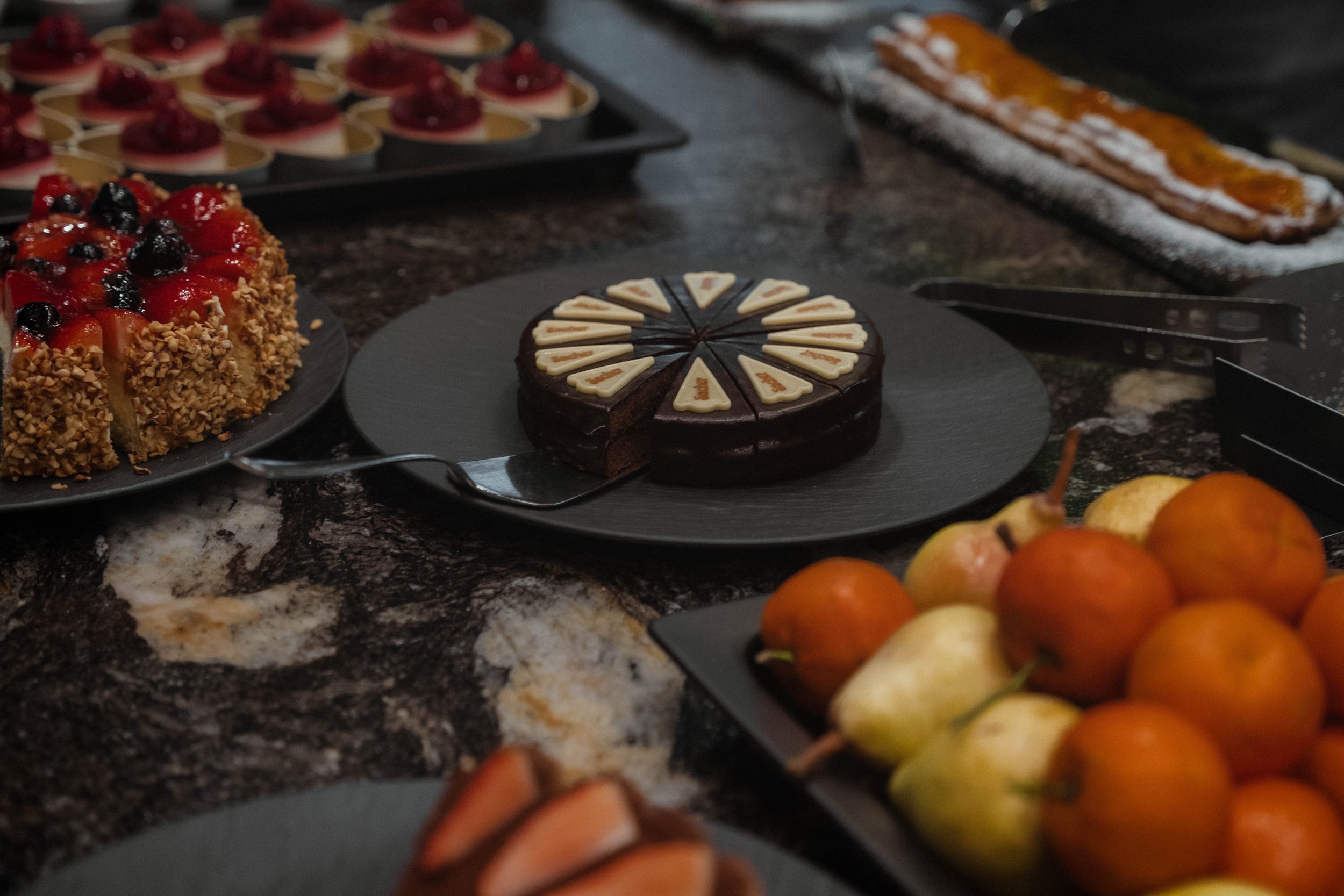 This image was taken indoors in Italy, in a quiet hotel called Bad Fallenbach where food, light, and atmosphere come together naturally. The scene isn’t about perfection or styling for the camera. It’s about presence — a moment of stillness before guests arrive, where desserts are prepared, fruit is arranged, and the space holds a calm, almost domestic warmth.
