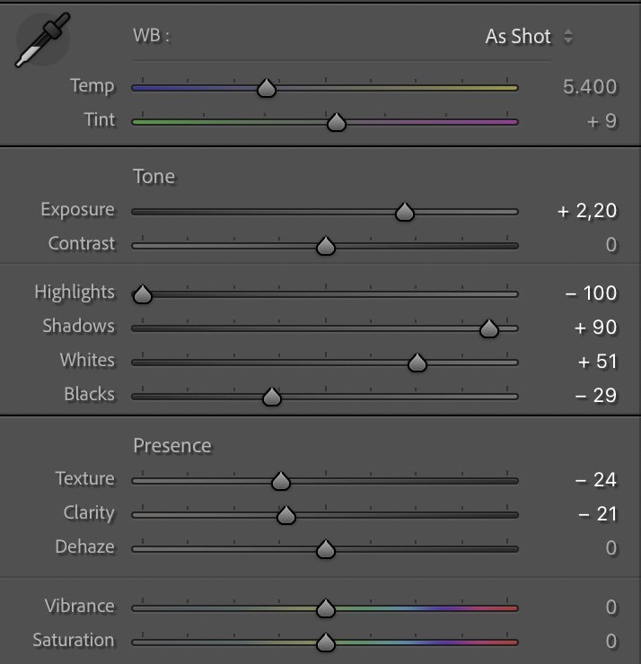 I lifted the Exposure (+2.20) to restore the brightness of the sunrise and reveal the structure in the fog. The Highlights (–100) were reduced to preserve detail in the sky, while the Shadows (+90) and Whites (+51) opened up the darker areas around the abbey and nearby houses. The Blacks (–29) kept enough contrast to ground the image.
