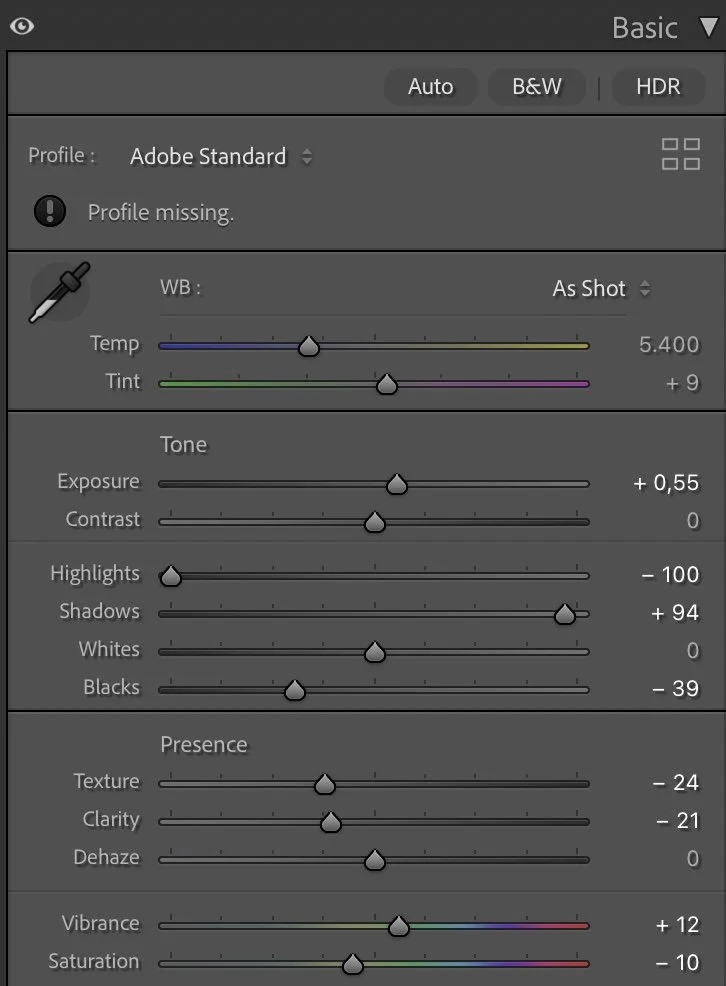 At the same time, I reduced the Highlights (-100) and raised the Shadows (+94) to even out the lighting and soften strong contrasts. This balance is the foundation for a more refined tonal curve later.