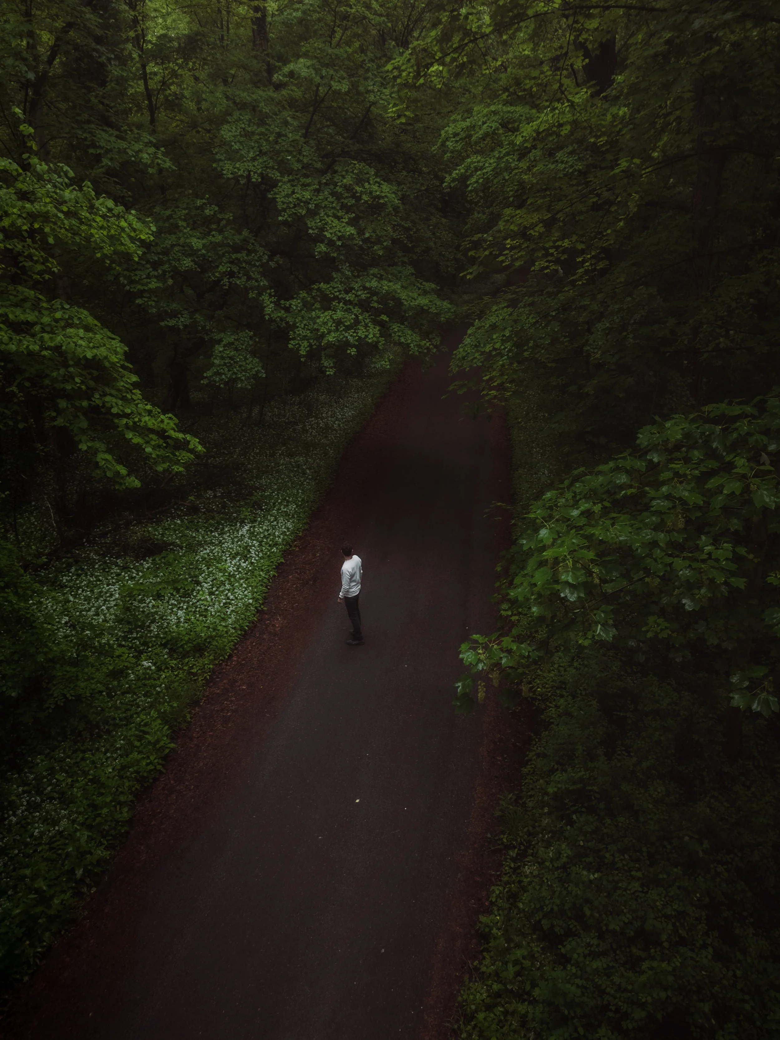 They don’t try to impress you. They just feel calm. This image was taken during a quiet walk in a forest near Mannheim in early spring. Fresh green leaves, soft light, and a simple road cutting through the trees. From above, everything looks almost abstract – just shapes, textures, and one small person in the middle.