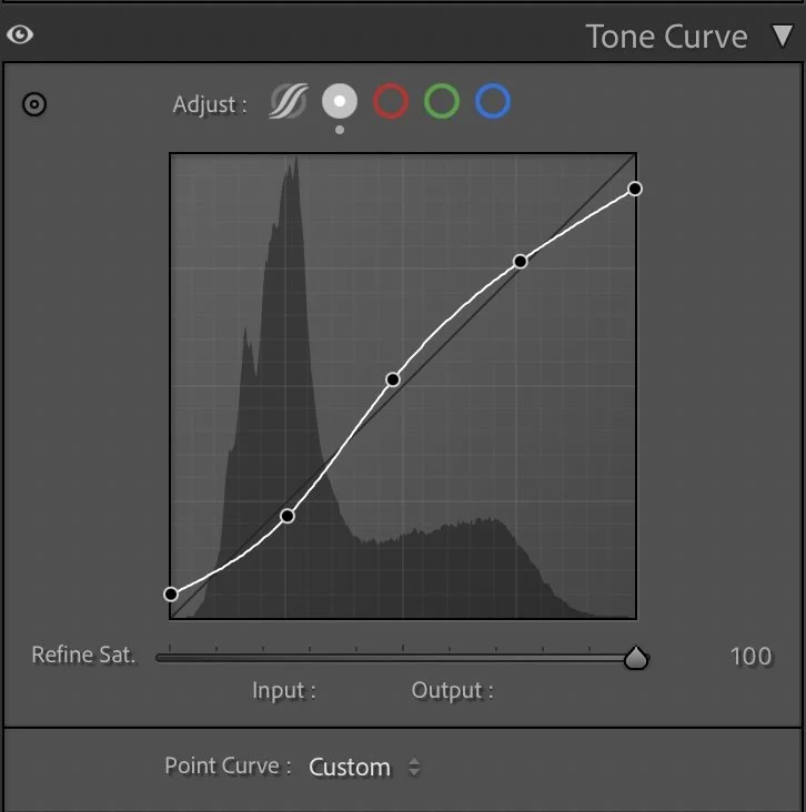 The tone curve follows a soft S-shape. Shadows are slightly lowered, midtones gently lifted, and highlights remain controlled.