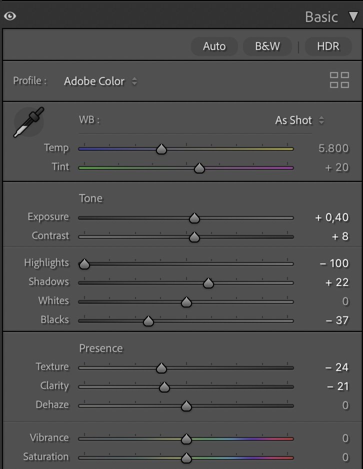 I slightly increased the overall exposure, but the real transformation came from reducing the highlights strongly and deepening the blacks.