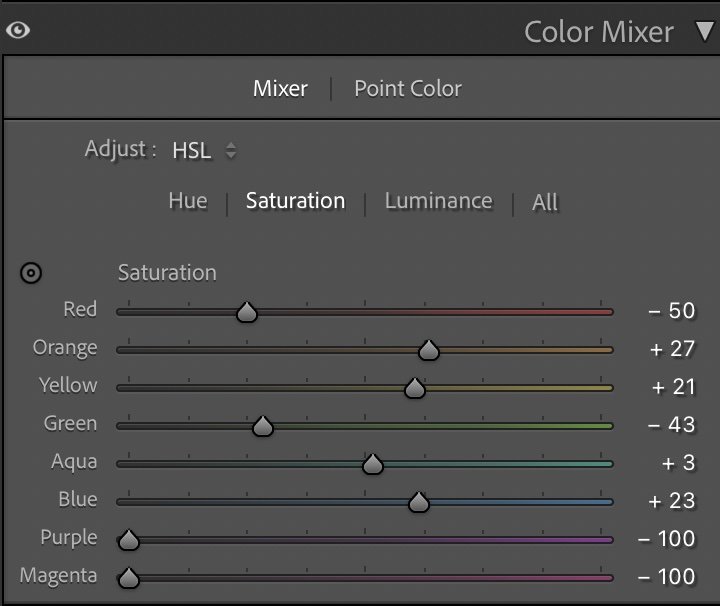 The aqua tones were shifted slightly to make the water feel cleaner and more defined. Blues were reduced a bit in saturation to keep the ocean calm and natural. At the same time, I slightly strengthened the orange tones so the surfer gained a touch of warmth. This creates subtle separation between subject and environment.